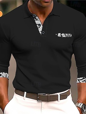 Муж. Поло вязанной вязки Рубашки-поло для гольфа Длинный рукав Футболки поло Отложной Винтаж На каждый день 3D С принтом Наступила зима Черный Белый Морской синий