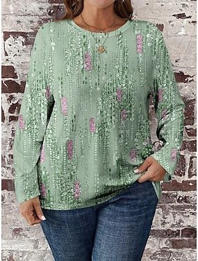 Женская футболка с круглым вырезом длинным рукавом туника цветочный элегантный винтажный обычная ежедневная выходные печать шалфейная зелёная