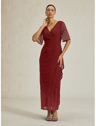 Жен. Длинное платье Платье-футляр Элегантный стиль Свадебный гость Для вечеринок Коктейльная вечеринка Стандартный Сплошной цвет С короткими рукавами V-образный вырез Красный Лето Весна Осень