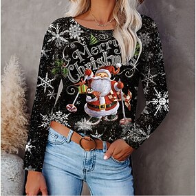 Новогодняя тематика Жен. Футболка Дед Мороз В снежинку На каждый день Длинный рукав Вырез под горло Обычные топы выходные С принтом Черный Белый Красный Синий Оранжевый Зима