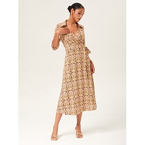 Жен. Женский Повседневное платье длинное платье платье макси Коричневый Рукав 3/4 Геометрический принт С принтом Лето Осень Демисезонный V-образный вырез Рубашечный воротник Отпуск Богемные XS S M