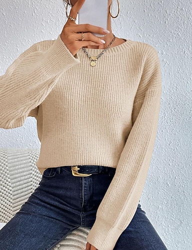 Жен. Вязаная ткань На каждый день Мягкий Чистый цвет Рельефный узор Вырез под горло Трикотаж Длинный рукав Обычные топы Вязать на открытом воздухе Повседневные выходные Черный Белый Осень Зима
