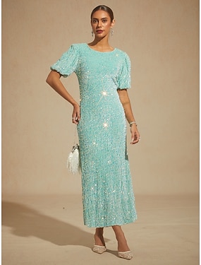 Жен. Платье средней длины Платье силуэта Русалка Элегантный стиль Рукава буффы Для вечеринок Пайетки Рукав до локтя Вырез под горло мудрец зеленый Весна Осень Зима