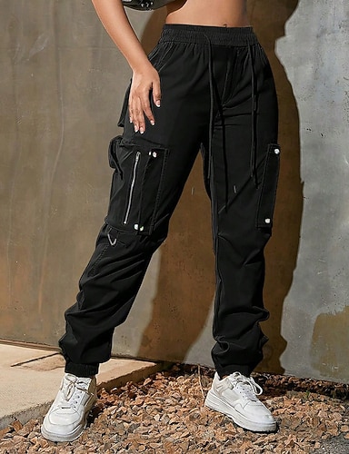 Жен. Брюки карго Брюки Мода Уличный стиль Полная длина Средняя талия Однотонный Карман Удобный Слабоэластичная Для занятий спортом На каждый день Черный Бежевый Лето Весна Стандартный