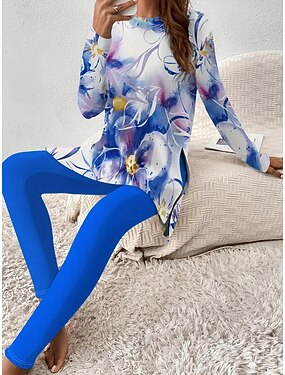 Женский набор пижам с длинными рукавами повседневная одежда круглый вырез модные брюки графическая цветочная печать синий фиолетовый классическая посадка