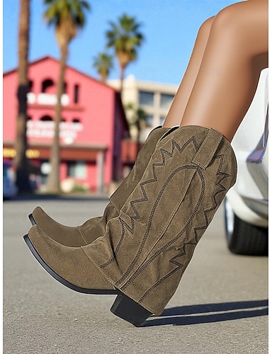 Женские ковбойские сапоги цвета хаки до середины голени из искусственной замши в стиле вестерн с вышитыми деталями и низким каблуком. Удобные сапоги для верховой езды на осень-зиму для улицы, ранчо и