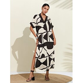 Жен. Женский Повседневное платье длинное платье платье макси Черно-белый С короткими рукавами Абстракция Геометрический Лето V-образный вырез Рубашечный воротник Отпуск Современное XS S M