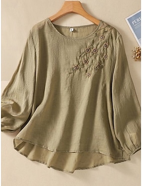 Жен. Рубашки из хлопка и льна Сплошной цвет Классический На каждый день Рукав 3/4 Вырез под горло Обычные топы Повседневные Карман Пуговицы Белый Винный Зеленый Хаки Лето Весна Осень