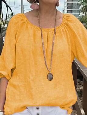 Жен. Рубашки, вдохновленные льном Летние вершины пожимает плечами Сплошной цвет Повседневные На каждый день Рукав 3/4 V-образный вырез Обычные топы Черный Белый Розовый Коричневый Абрикосовый