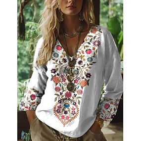 Жен. Блуза Цветочный принт Графика Геометрический принт Богемия Винтаж Гавайский Длинный рукав V-образный вырез Обычные топы Рюши С принтом Черный Белый Зеленый Лето Весна