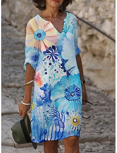 Жен. Платье средней длины Повседневное платье Платье с принтом Мода Современное Повседневные Пляж выходные Стандартный Цветочный принт Рукав 3/4 Вырез под горло Желтый Синий Лиловый Серый