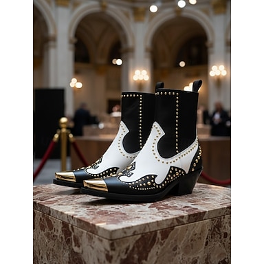 Женские черные кожаные ботинки в стиле вестерн с золотыми заклепками и металлическим носком — ботинки на массивном каблуке в ковбойском стиле для модной уличной одежды и вечеринок.