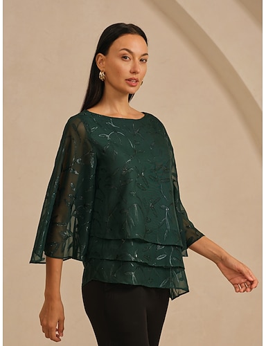 женская блузка с круглым вырезом, фактурный шифон, ткань с эффектом выгорания, расклешенные рукава три четверти, многослойный подол, элегантная для вечеринки и отдыха
