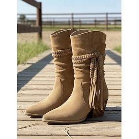 Женские замшевые сапоги до середины голени в богемном стиле с плетеными кисточками и массивным каблуком — повседневная обувь для вечеринок и фестивалей в стиле ретро-вестерн