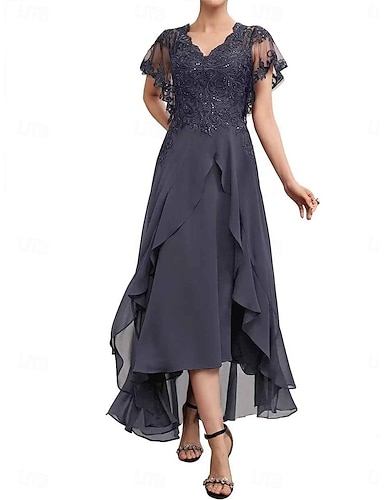 Платье в стиле A-Line для матери невесты Элегантное V-образное декольте Чайной длины Шифон Короткий рукав с однотонным цветом