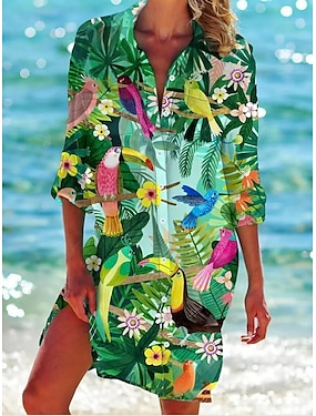 Жен. Мини-платье Сарафан Отпуск Пляжный стиль Отпуск Повседневные Пляж Свободное облегание Графика тропический Длинный рукав Рубашечный воротник Зеленый Весна Осень