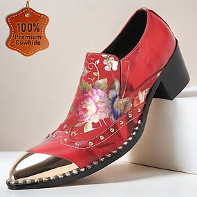 смелые и стильные мужские кожаные туфли красного цвета с цветочной вышивкой и золотым носком — уникальные и стильные для свадеб или вечеринок