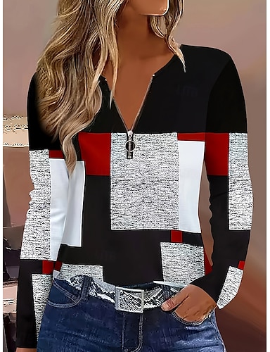 Женская футболка с молнией на четверть длинный рукав повседневная графика геометрическая абстракция винтажная современная V-образный вырез обычные топы каждый день желтый розовый красный синий весна