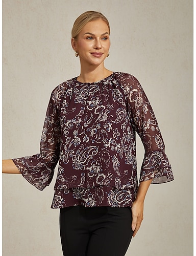 Жен. Топы из шифона Цветочный принт Графика Элегантный стиль Повседневные Стиль Рукав до локтя Летучая мышь Вырез под горло Обычные топы Свадебный гость Офис Повседневные Многослойный Темно синий