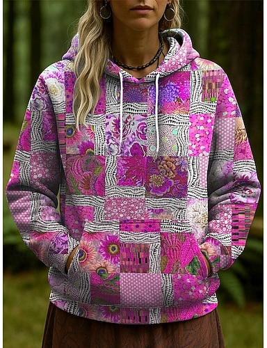 Женская толстовка с 3D-принтом в винтажном стиле Boho патчворк цветочная пуловер толстовка блок повседневная с капюшоном вечерняя одежда уличная одежда розовая синяя фиолетовая зеленая хаки весна