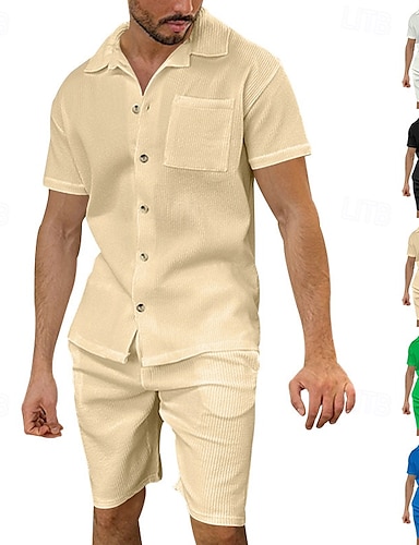 Муж. Рубашка 2 предмета Комплект рубашки Летняя рубашка Подходящие наборы Полотняное плетение Отпуск Для улицы Черный Белый Темно синий Цвет хаки С короткими рукавами V-образный вырез Лето Одежда