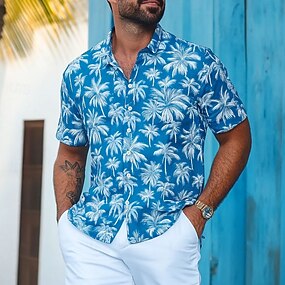 Муж. Пальма Тропические растения Гавайская рубашка Рубашка Алоха Футболки с принтом Короткие рукава Рубашка Воротник-стойка Гавайский Прибегнуть Отпуск Праздники На каждый день Синий S M L