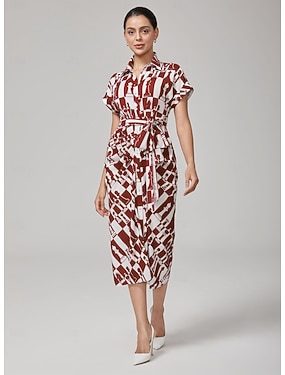 Жен. Мужской Повседневное платье Платье средней длины Винный С короткими рукавами Геометрический принт Лето Осень Демисезонный Рубашечный воротник На каждый день XS S M