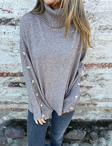 Жен. Вязаная ткань Мода Уличный стиль На каждый день Чистый цвет Рельефный узор Хомут Пуговицы Трикотаж Длинный рукав Обычные топы Вязать на открытом воздухе Повседневные выходные Черный Осень Зима