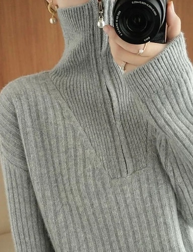 Жен. Вязаная ткань Мода Классический На каждый день Чистый цвет Рельефный узор Половина молния Молния Трикотаж Длинный рукав Обычные топы Вязать на открытом воздухе Повседневные выходные Серый