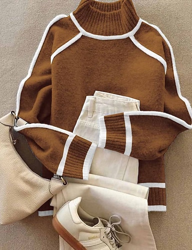 Жен. Вязаная ткань Пуловер Уличный стиль На каждый день Сплошной цвет Воротник-стойка Трикотаж Длинный рукав Обычные топы Вязать Повседневные На выход выходные Черный Белый Осень Зима