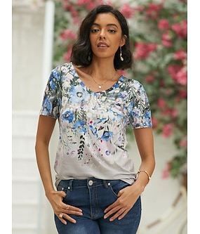 женская футболка с простым цветочным принтом, короткий рукав, обычные топы, v-образный вырез, праздничный уик-энд, розовый, синий, зеленый