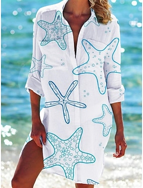 Жен. Рубашка Блуза Графика На каждый день Пляжный стиль Длинный рукав Рубашечный воротник Длинные топы Отпуск Пляж Пуговицы Карман С принтом Белый Светло-зеленый Синий Зеленый Весна лето