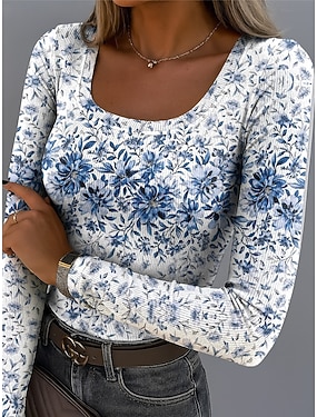 Жен. Туника Цветочный принт Графика Растения Винтаж Мода Стиль Длинный рукав Квадратный вырез Обычные топы Повседневные С принтом Белый Желтый Светло-зеленый Розовый Тёмно-синий Весна Осень
