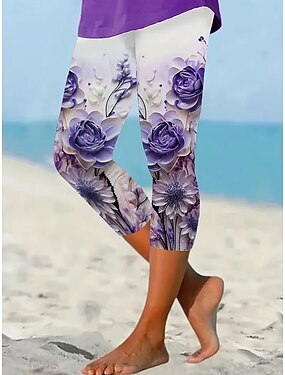 Жен. Леггинсы Отпуск Винтаж Мода Капри Завышенная Цветочный принт Графика Рисунок Мягкий Дышащий Эластичная Официальные Отпуск Офис Белый Лиловый Лето Весна Приталенный крой