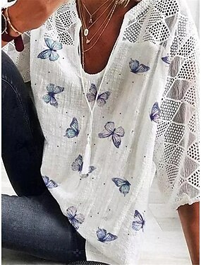 Жен. Рубашка Блуза Бабочка Повседневные Классический Рукав 3/4 V-образный вырез Обычные топы Повседневные Пэчворк С принтом Белый Желтый Синий Лето Весна