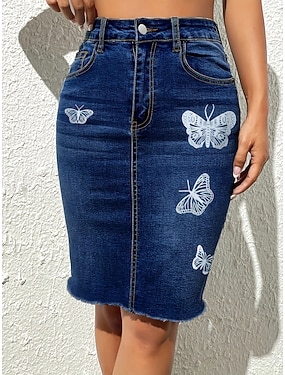 Жен. Юбки Облегающий силуэт Мода На каждый день До колена Завышенная Подол Бабочка Карман С принтом Слабоэластичная Для улицы Повседневные Черный Морской синий Синий Весна Полиэстер Джинса
