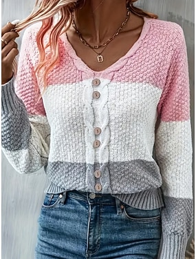 Жен. Вязаная ткань На каждый день Контрастных цветов Кабель Вырез под горло Трикотаж Длинный рукав Обычные топы Вязать Повседневные Розовый Весна Осень