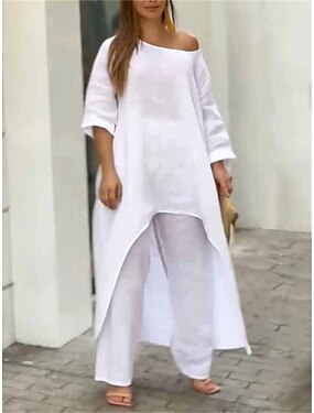 женские комплекты из двух предметов, вдохновленные льном, модные, простые, повседневные, для улицы, свидания, аэропорта, дышащие, с круглым вырезом, с длинным рукавом, летние, весенние, домашние наряды