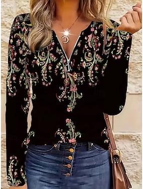 Женская футболка с короткой молнией на груди длинный рукав повседневная графическая tribal винтажная бохо тропическая гавайская V-образный вырез обычные топы для повседневной носки черная весна осень