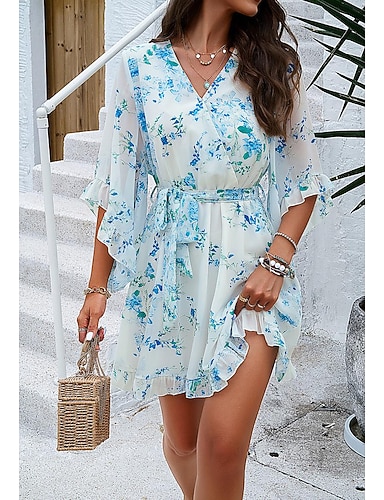 Жен. Мини-платье Повседневное платье Платье-футболка Сарафан Платье A-силуэта Отпуск На каждый день Богемный Пляж Стандартный Омбре Цветочный принт Графика С короткими рукавами V-образный вырез