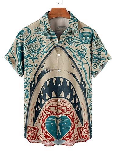 Муж. Акула тропический Рубашка Гавайская рубашка Рубашка Алоха С короткими рукавами Рубашка Отложной На каждый день на открытом воздухе Для улицы На каждый день Розовый Красный Синий S M L