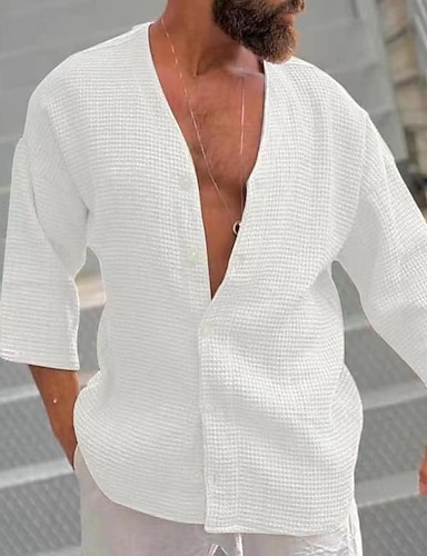 Муж. Рубашка Вафельная рубашка Летняя рубашка Повседневная рубашка Кнопка рубашка Белый Розовый Зеленый Хаки Темно-серый Длинный рукав Полотняное плетение Лацкан Отпуск Повседневные Одежда