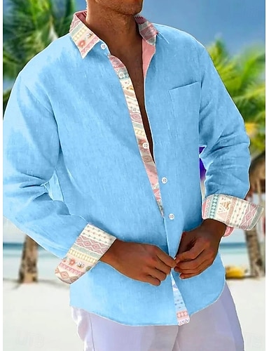 Муж. Рубашка Летняя рубашка Повседневная рубашка Пляжная рубашка Кнопка рубашка Белый Розовый Небесно-голубой Оранжевый Длинный рукав Полотняное плетение Рисунок Лацкан Отпуск Гавайский Кнопка вниз