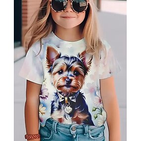 Девочки 3D С собакой Футболка С короткими рукавами Лето Весна Мода Классический Дети 4-12 лет Вырез под горло на открытом воздухе Повседневные Стандартный