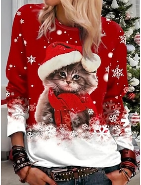 Новогодняя тематика Жен. Футболка Графика Животное Кот Мода На каждый день Длинный рукав Вырез под горло Обычные топы Повседневные выходные С принтом Красный Лето Весна Осень Зима