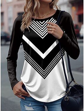 Жен. Футболка Графика Геометрический принт Абстракция Мода Стиль На каждый день Длинный рукав Вырез под горло Обычные топы Повседневные Пэчворк С принтом Асимметричный вырез