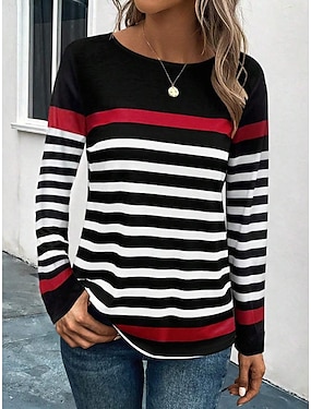 Стильная футболка для женщин в цветном блоке полосатая печать обычные топы ежедневная черный+белый+серый красный оранжевый весна осень предосень
