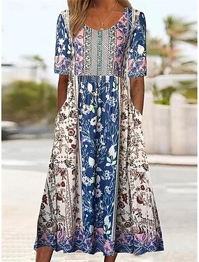 Жен. Платье средней длины Повседневное платье Летнее платье Платье в стиле бохо Этнический На каждый день Отпуск Повседневные Свидание Стандартный Цветочный принт С короткими рукавами Вырез под горло