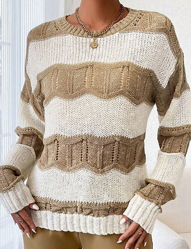 Жен. Вязаная ткань Пуловер Уличный стиль На каждый день Полоски Кабель Вырез под горло Пэчворк Трикотаж Длинный рукав Обычные топы Вязать Праздники На выход выходные Абрикосовый Осень Зима