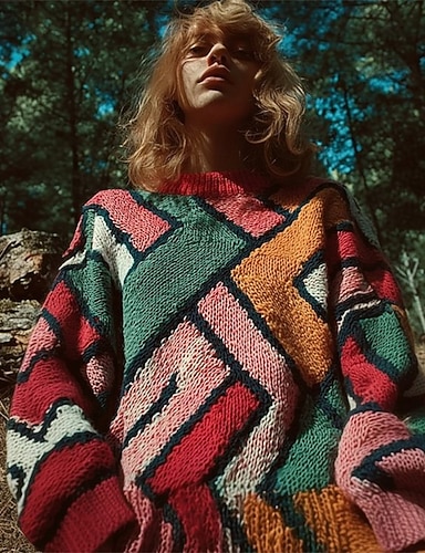 Жен. Пуловер Отпуск Повседневные Геометрический принт Контрастных цветов Рельефный узор Хомут С принтом Длинный рукав Обычные топы Вязать на открытом воздухе Повседневные Праздники Синий Коричневый
